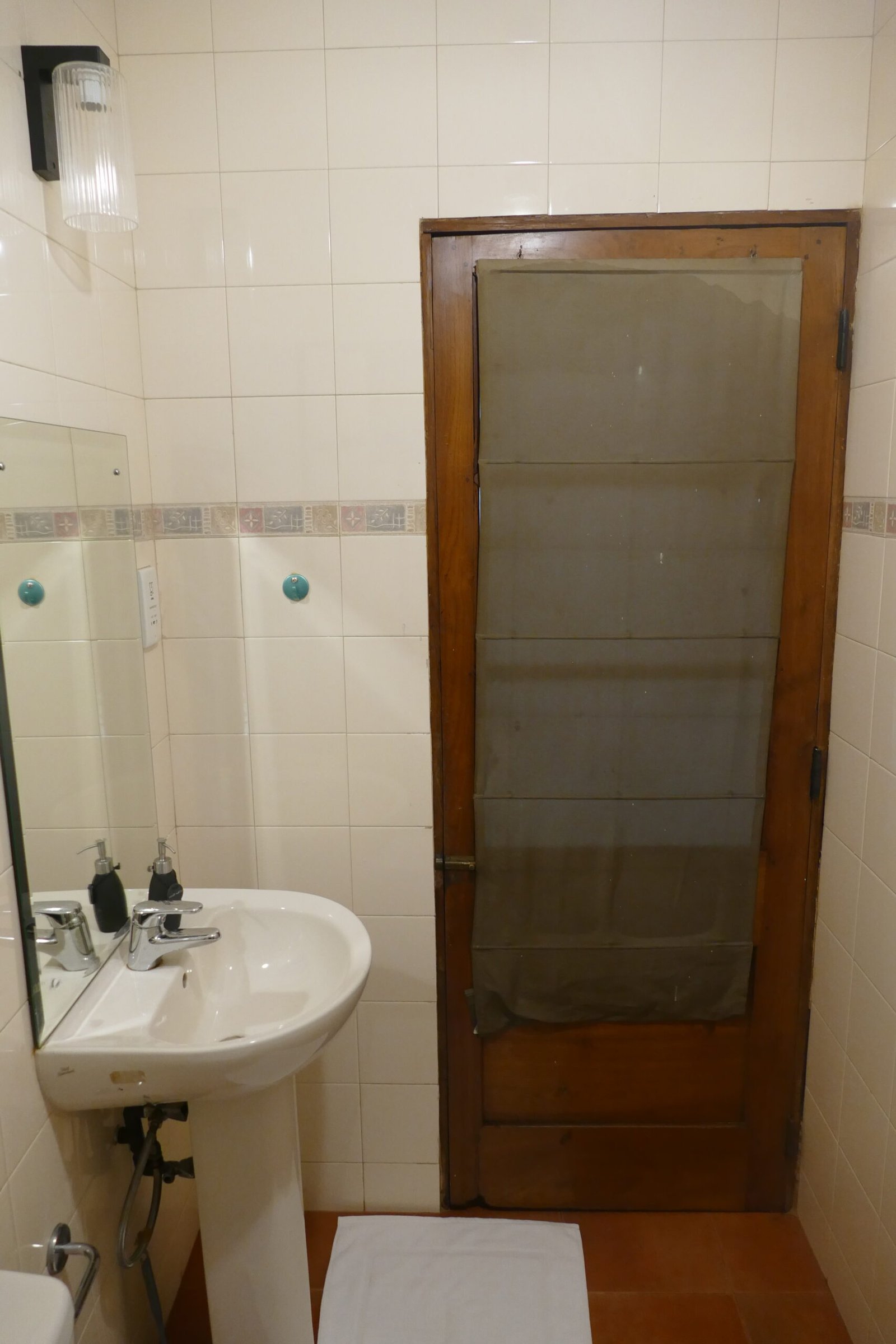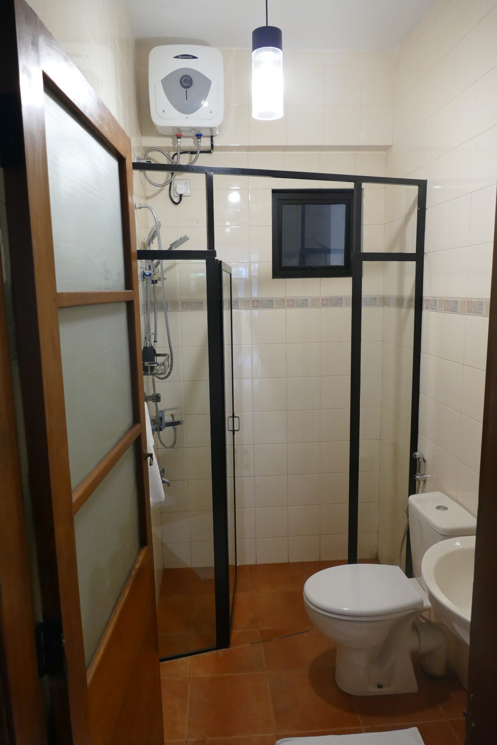 This clean and comfortable room includes a double bed with fresh linens, a wooden wardrobe, a writing desk with chair, tiled flooring, ceiling fan, air-conditioning, wall lighting, and a window with a privacy blind; the *detached bathroom*, located outside the room, features a hot water shower, wash basin with mirror, modern fittings, and space for toiletries, offering a simple and practical stay.