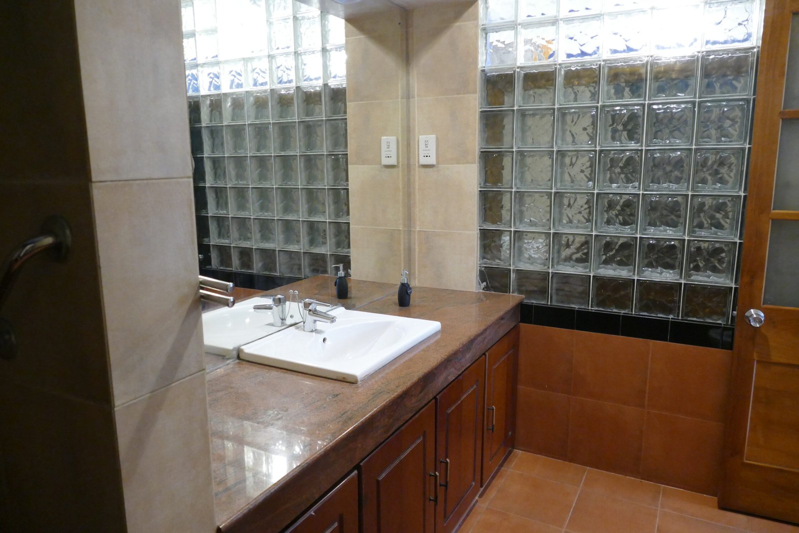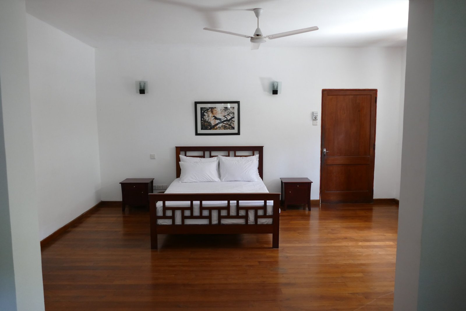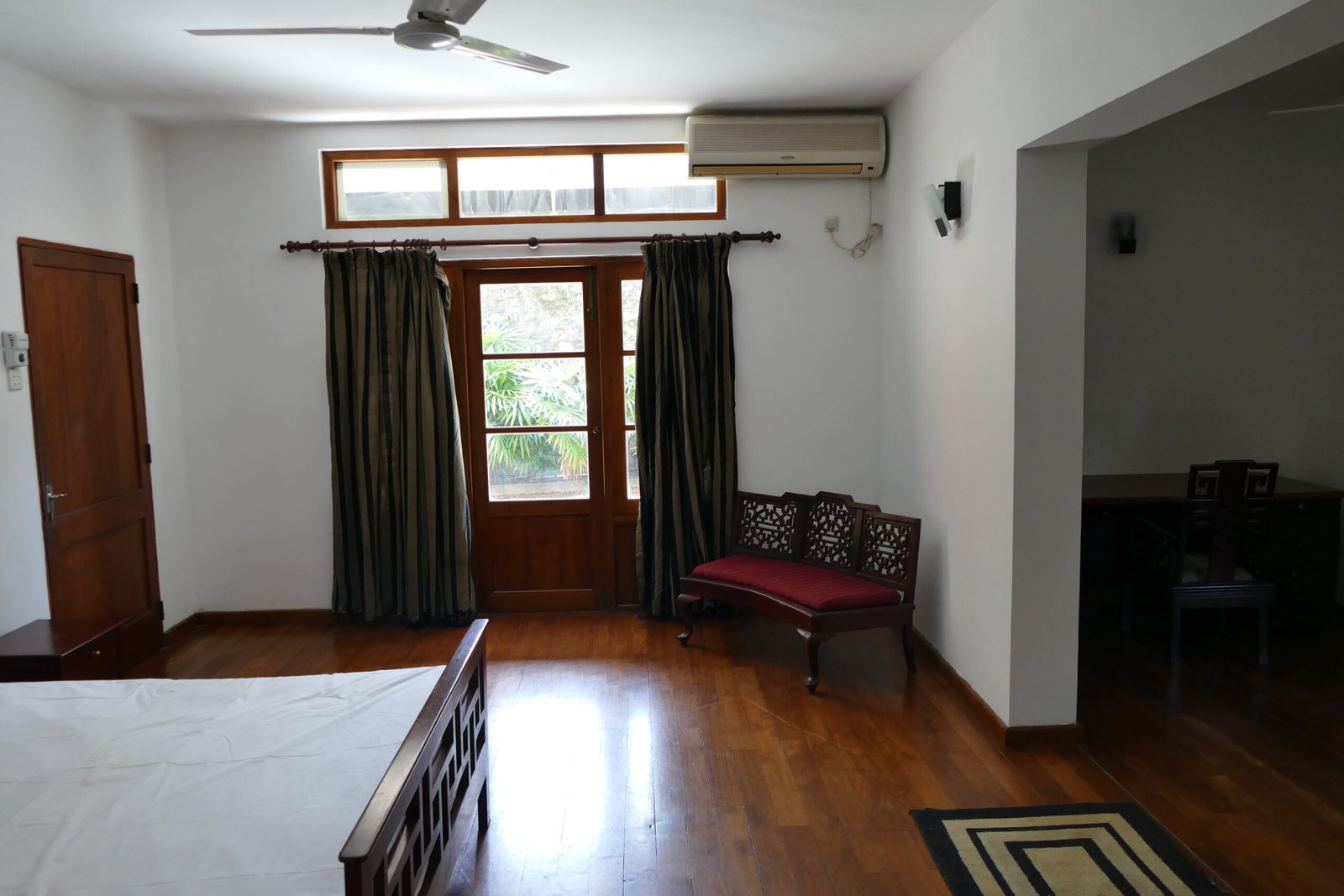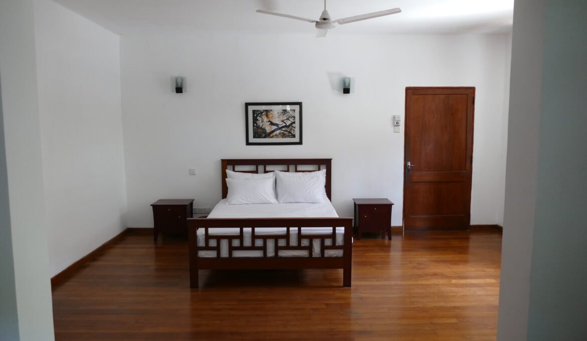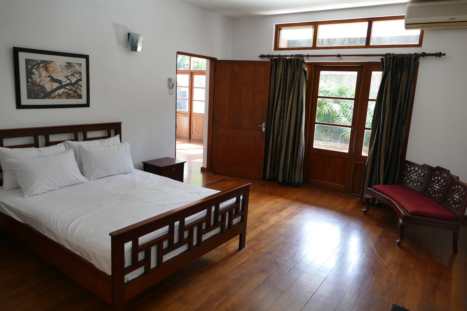 This spacious room offers a calm and airy stay with polished wooden floors, large windows that bring in natural light, and a comfortable queen bed with fresh linens. It includes a dedicated work desk with chair, bedside tables, ample built-in wardrobe space, ceiling fans, air conditioning, soft lighting, and seating for added comfort. The detached bathroom is located just outside the room and features a walk-in shower, modern fittings, a wide vanity counter with sink, storage cabinets, and fresh towels, ensuring privacy while keeping the living space quiet and uncluttered.